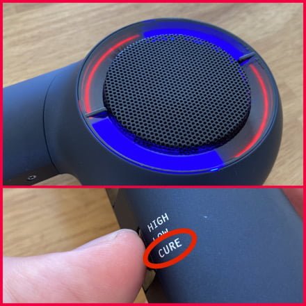 CUREモードにすると風量はかなり弱くなり、暖かい温風が緩やかに出ます。火傷しない温度なので、直接幹部に当てて使います。