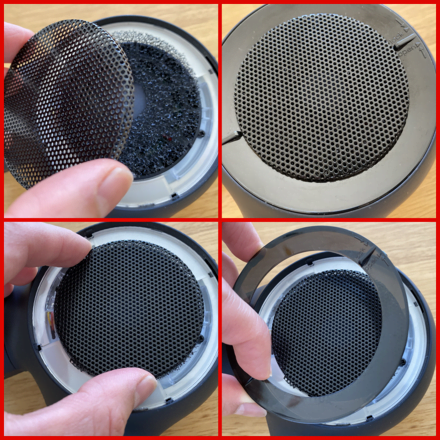本体のお掃除方法は、両側に付いているフィルターを外し、優しくお水またはお湯で揉み洗いしてほこりをとる。フィルターはしっかり乾燥させてから本体に装着させます。水分が残っていると故障の原因になります。