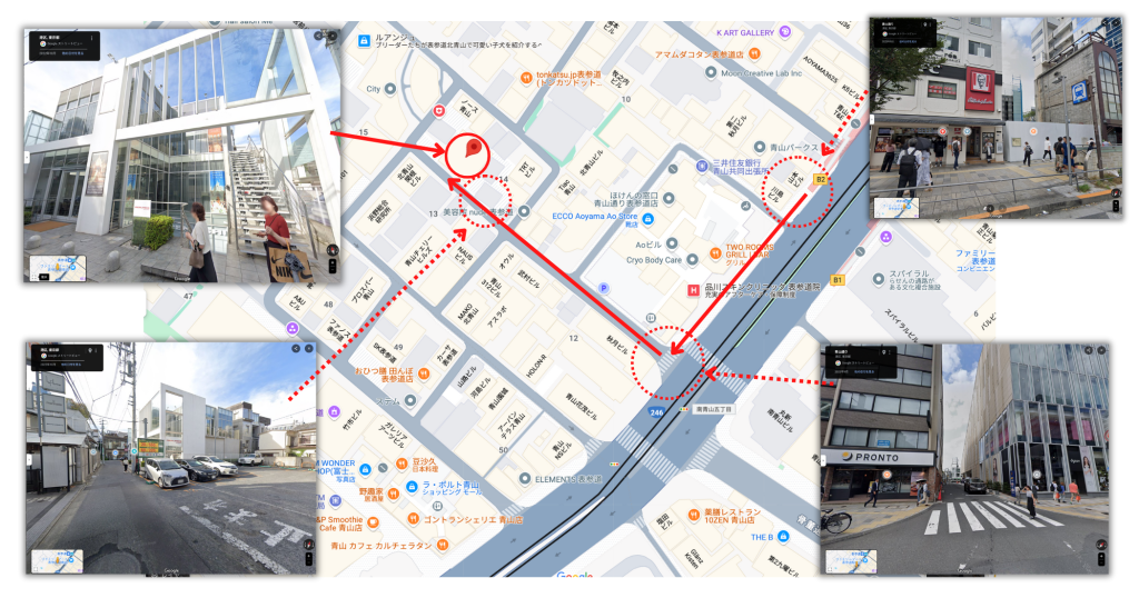 表参道駅 B2出口から出て直線に進み、プロントとAOビルの角(昔はダイソンがあった)の道を入り駐車場が見えるまで直進します。