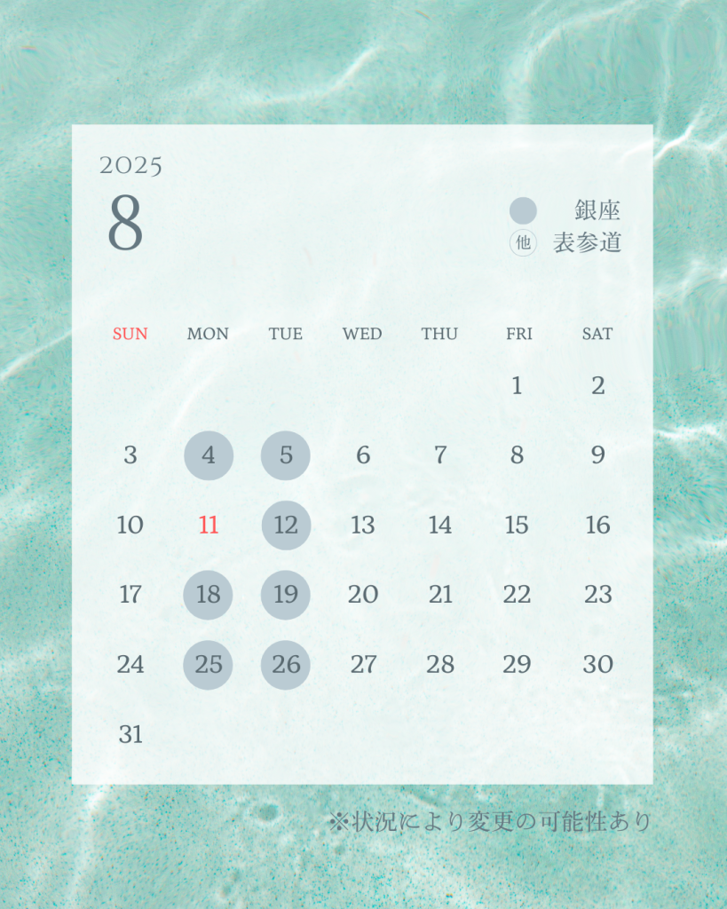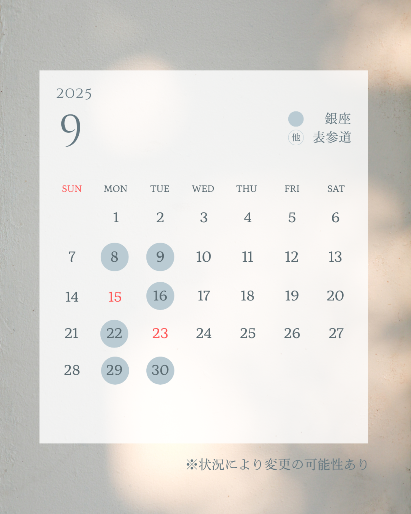 基本的には上記スケジュールになりますが、午前は銀座勤務で午後は表参道勤務になる場合がありますのでご要望は予約サイトのメッセージ機能・LINE・インスタグラムからご連絡いただけると幸いです🙏